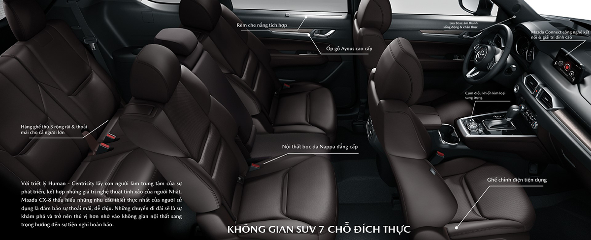 Ngoài ra, CX-8 còn sở hữu nhiều tiện nghi hỗ trợ tối đa người lái như ghế ngồi có kết cấu giúp định hình cột sống và xương chậu; điều hòa tự động 3 vùng độc lập; hệ thống loa Bose cao cấp với loa woofer (loa trầm). Mazda CX-8 còn có thêm phiên bản 6 ghế, bố trí hàng ghế thứ 2 kiểu “Captain's Seat” với bệ tì tay riêng biệt, trang bị cao cấp độc nhất so với các thương hiệu ô tô Nhật Bản khác.