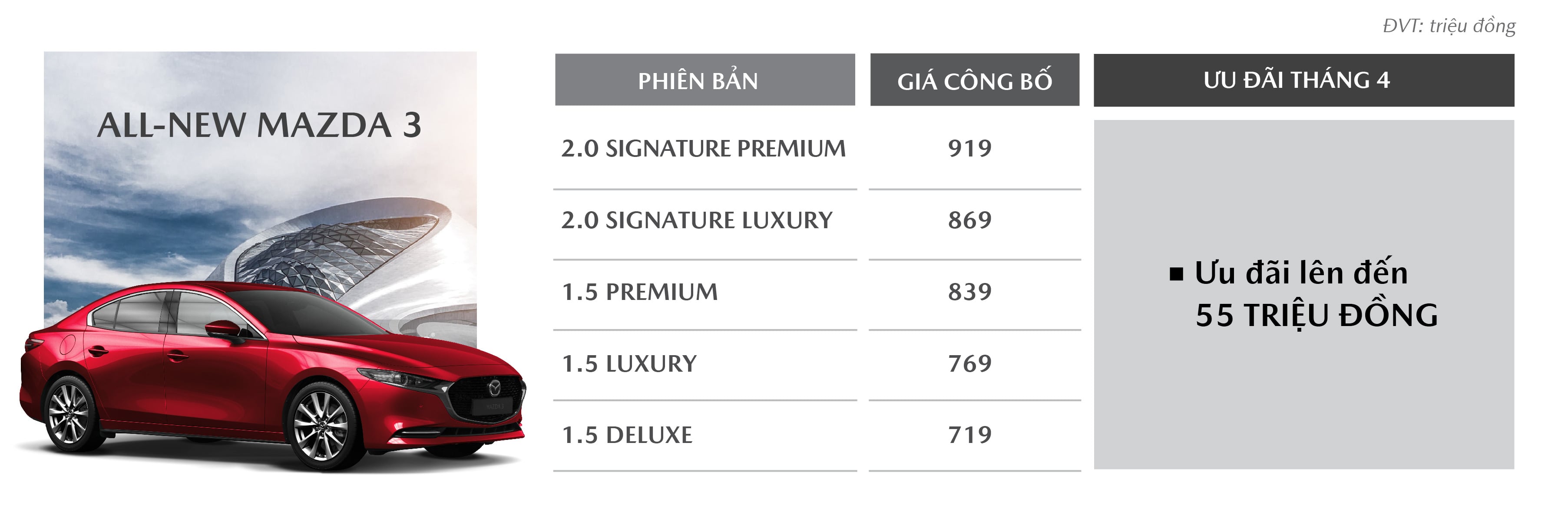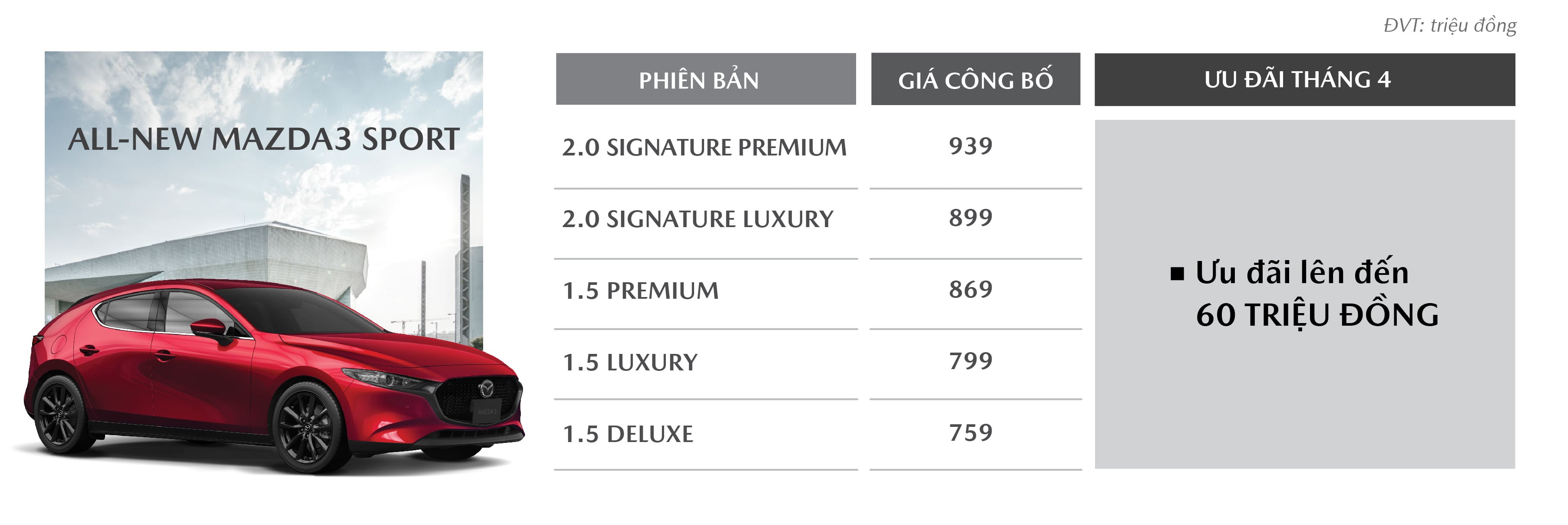 Nhân sự kiện Mazda3 2020 chiến thắng hạng mục “Thiết kế xe của năm” tại “Giải thưởng xe hơi thế giới” (World Car Awards), All-New Mazda3 và All-New Mazda3 Sport được nhận ưu đãi lên đến 60 triệu đồng từ hãng bên cạnh nhiều quà tặng và ưu đãi giá trị khác đến từ Đại Lý. Đây được coi là mức ưu đãi hấp dẫn nhất trong phân khúc C giai đoạn từ nay đến hết tháng 4.